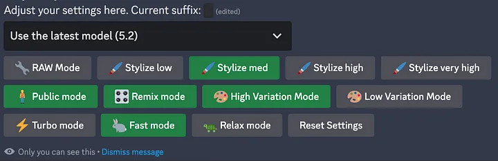 /settings: 설정 명령을 사용하면 버전, 스타일, 품질 및 모드 간을 전환할 수 있는 패널이 열립니다.
