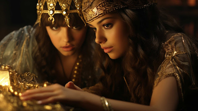 1980년대 영화 장면, 필름 느와르, 미스터리 영화, 커다란 금 보물 상자를 여는 고대 이집트 여성 2명의 로우 앵글 미디엄 클로즈업 투샷, 콜라이닝 눈, 대담한 립 컬러, 정교한 가발, 흐르는 듯한 의상, 황토 및 골드 톤, 분위기 있는 조명, 극적인 명암 대비, 상형문자, 단서, 숨겨진 보물, 서스펜스