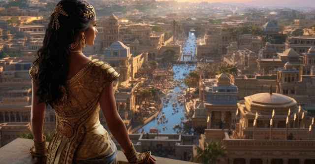 1980s cinematic scene, film noir, mystery film, low-angle medium closeup two-shot of 2 ancient Egyptian women opening a large gold treasure chest, kohl-lined eyes, bold lip colors, elaborate wigs, and flowing garments, ochre & gold tones, atmospheric lighting, dramatic light and shadow contrast, hieroglyphics, clues, hidden treasure, suspenseful --ar 16:9 --style raw
