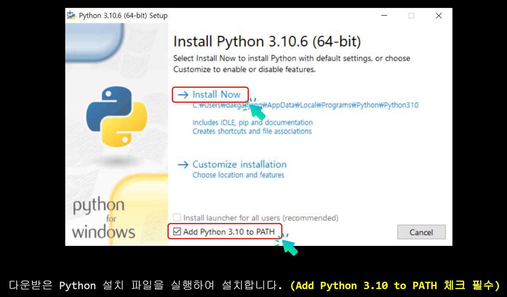 아래 Addy python 3.10 to PATH를 채크 후 인스톨 해야 함 차 후 업데이트에 문제가 생길 수 있음